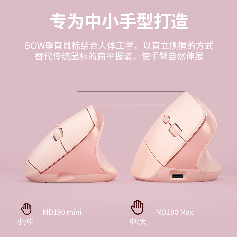B.O.W航世 MD190mini是一款专为中小手设计的人体工学鼠标。这款鼠标采用垂直设计,适合长时间使用电脑的用户,可以有效减少手腕的压力和疲劳感。MD190mini还支持无线蓝牙连接,无论是笔记本还是台式机都能轻松应对。