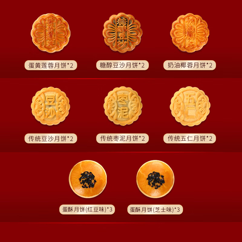 • 多重口味:五仁、蛋黄莲蓉等多种经典口味选择,让您的家人和朋友都能享受到美味佳肴;