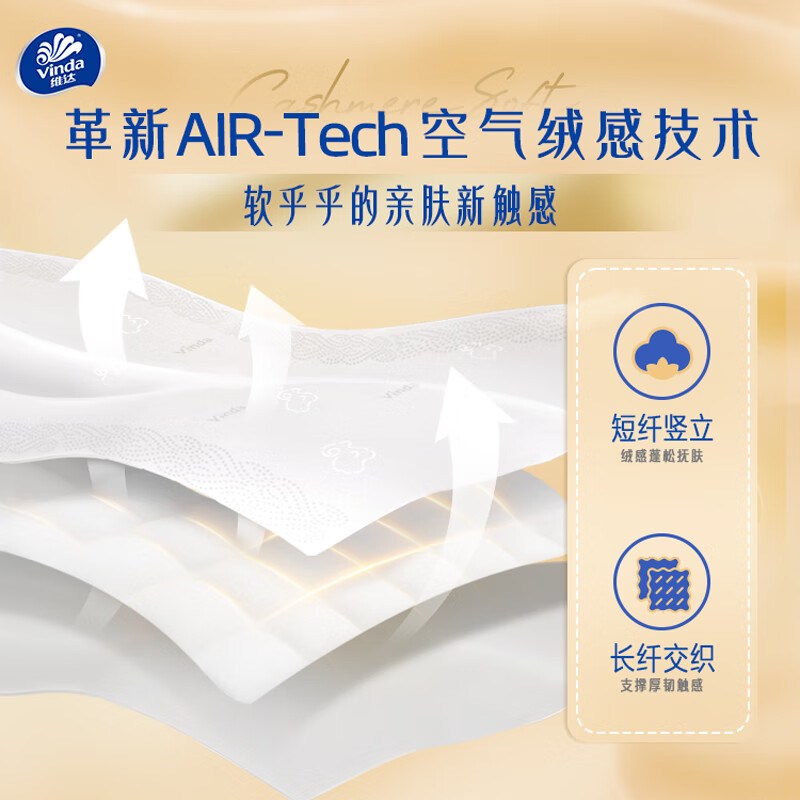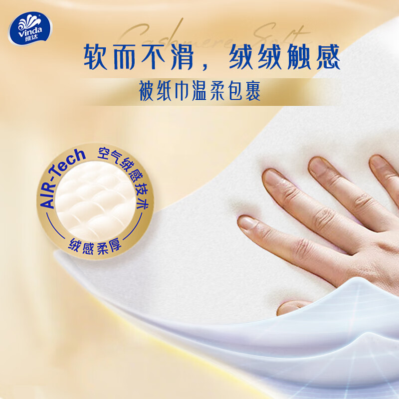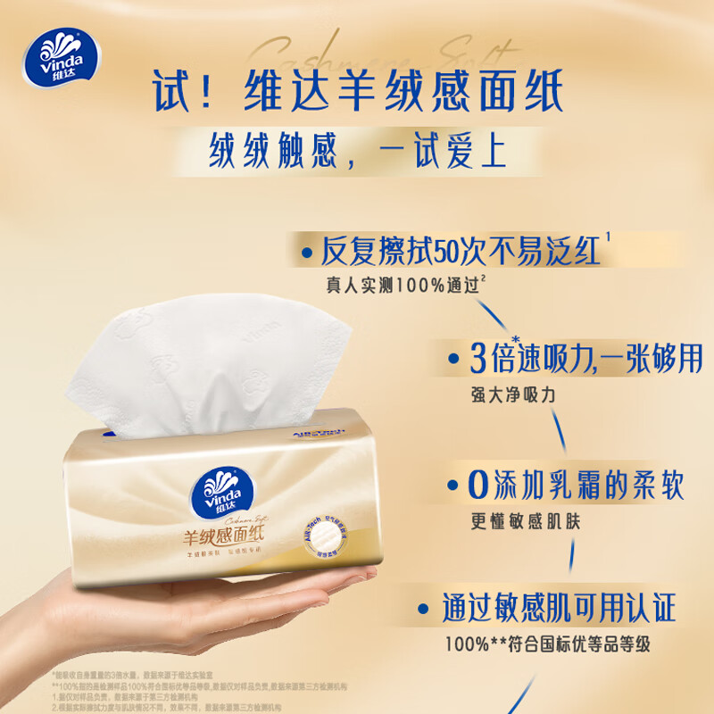 维达(Vinda)抽纸 羊绒感面纸70抽*3包M码 - 敏感肌适用,只需12.9元!细腻触感,吸水性强,适合敏感肌肤使用。