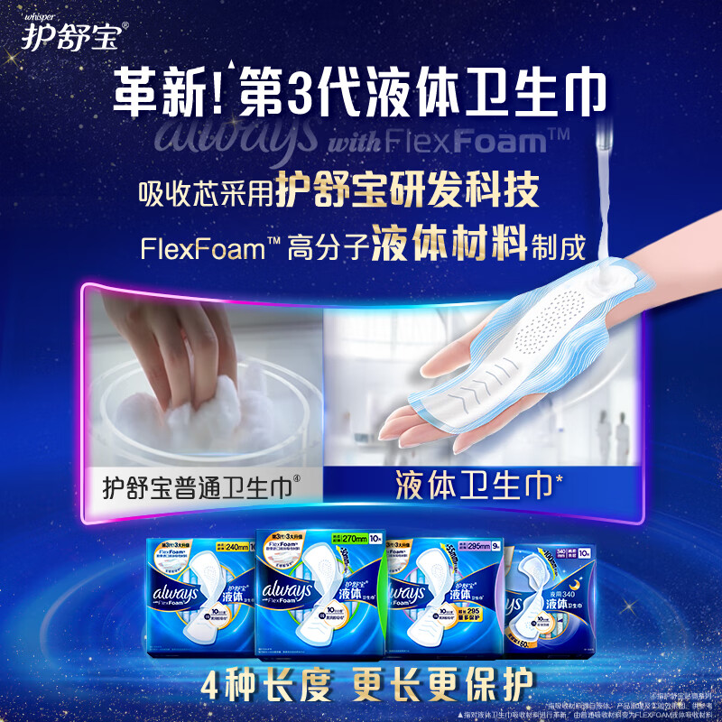 护舒宝液体卫生巾为女性提供了全新的体验,适用于量多日用。这款加长型(270mm)的液体卫生巾可以提供无感保护,让你在任何情况下都感到舒适和自在。
