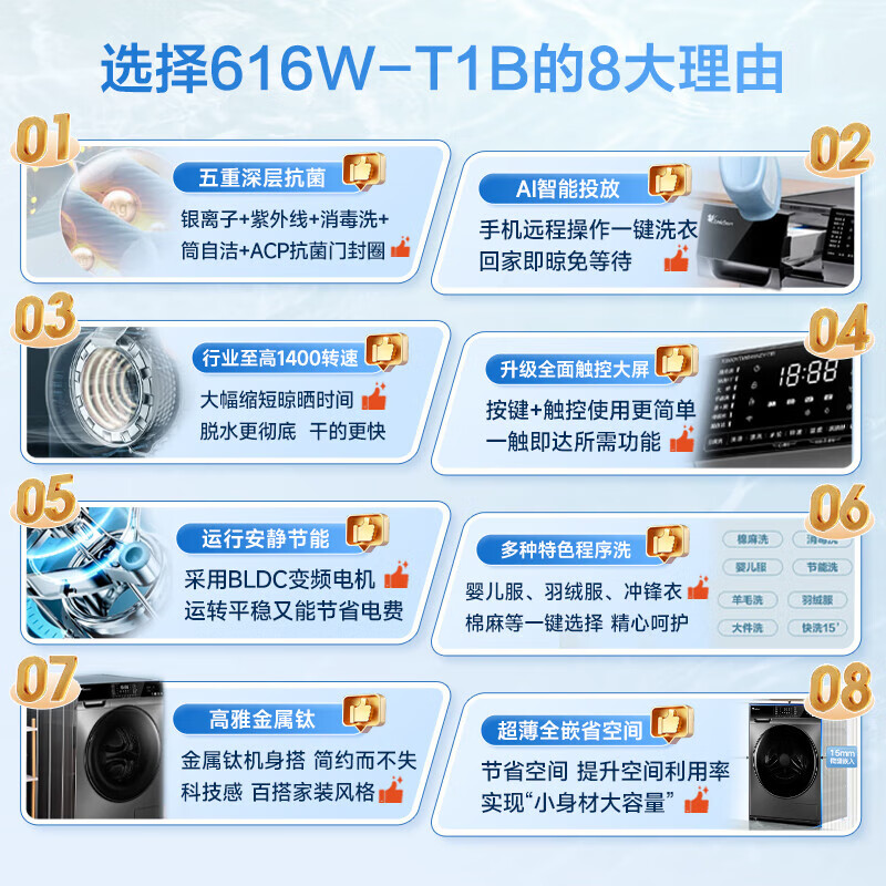 - 智能投放:根据衣物的重量和脏污程度自动调节用水量和洗衣剂用量,省水又环保;