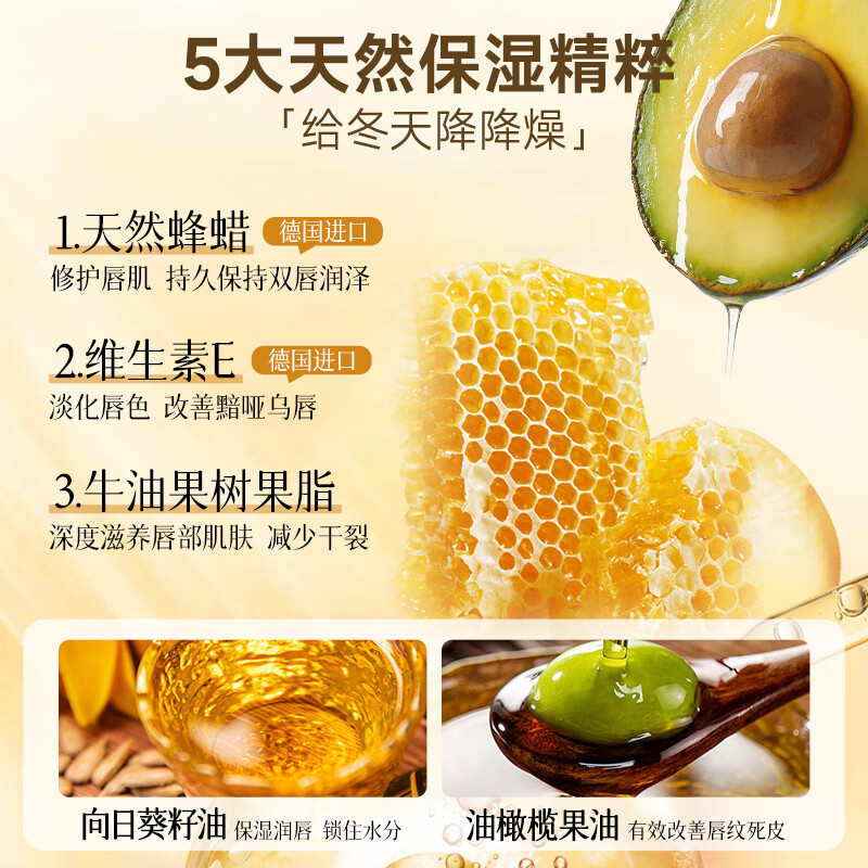 - 修复肌肤: 蜂蜜成分有助于修护受损肌肤,恢复唇部自然弹性与光泽。