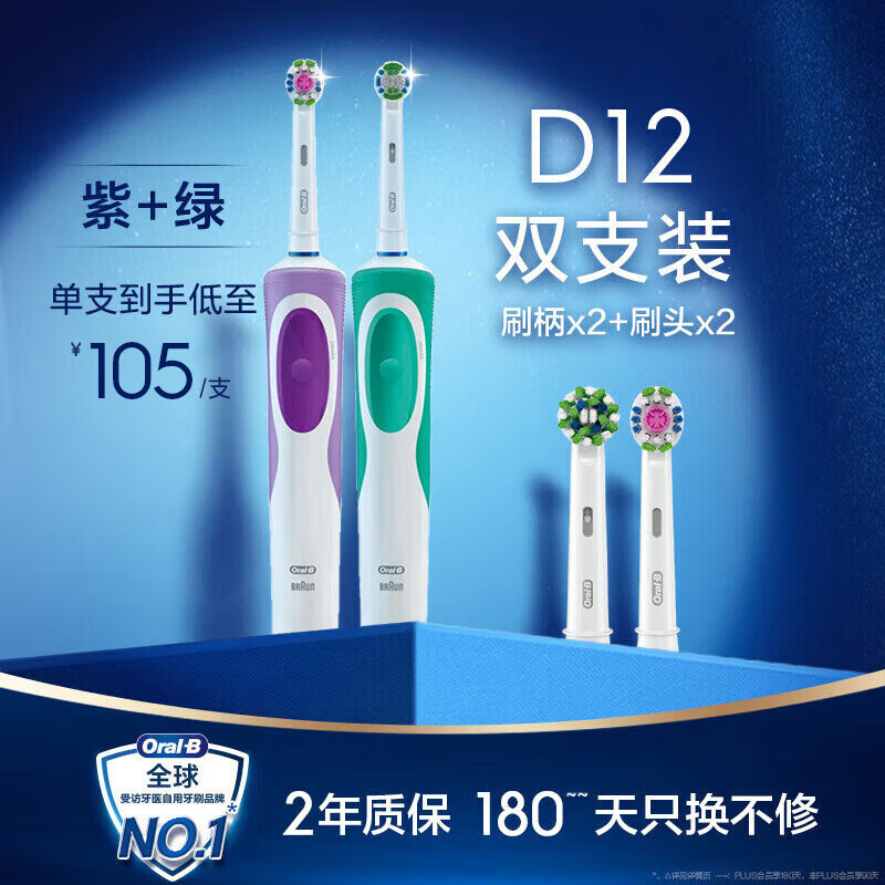 欧乐B电动牙刷成人套装,提供男士和女士适用版本。这款套装包含两支不同颜色的圆头牙刷,分别是紫色和绿色款式。