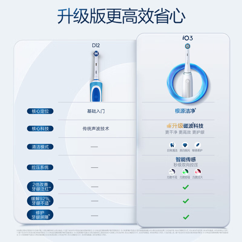 - 高效清洁,口腔无忧: 欧乐B电动牙刷采用2D声波震动技术,深度清洁牙齿缝隙中的食物残渣和细菌。