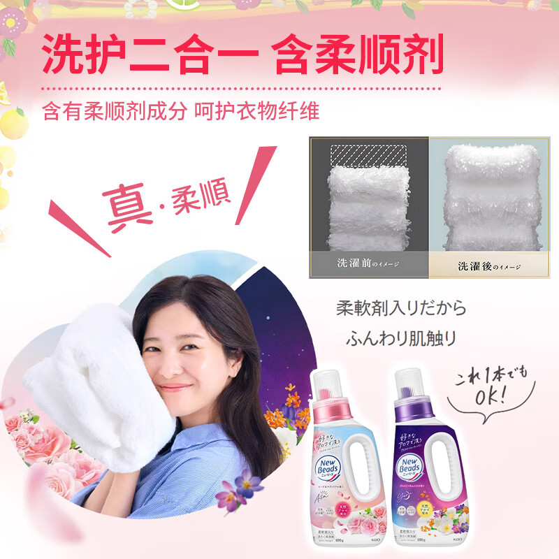 只需将适量的花王茉莉花香洗衣液倒入洗衣机内或直接手洗时加入,即可轻松实现衣物的洁净护理。特别适合需要长时间保持衣物清新香气的需求用户。
