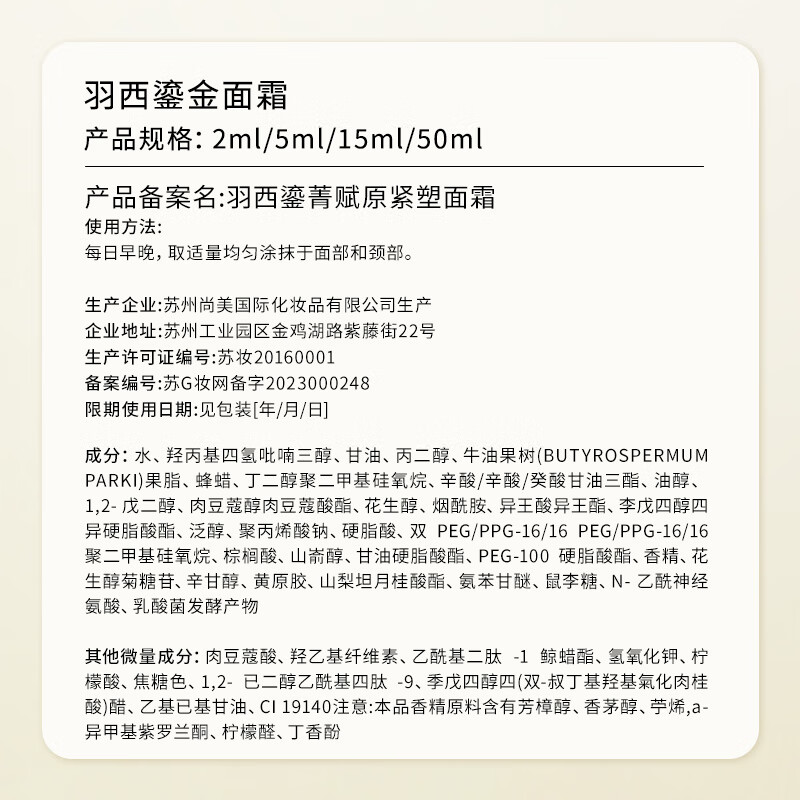 羽西鎏金面霜50ml保湿修护紧致淡纹玻色因生日礼盒