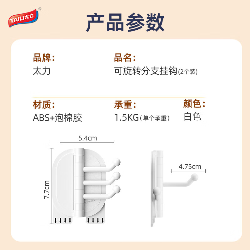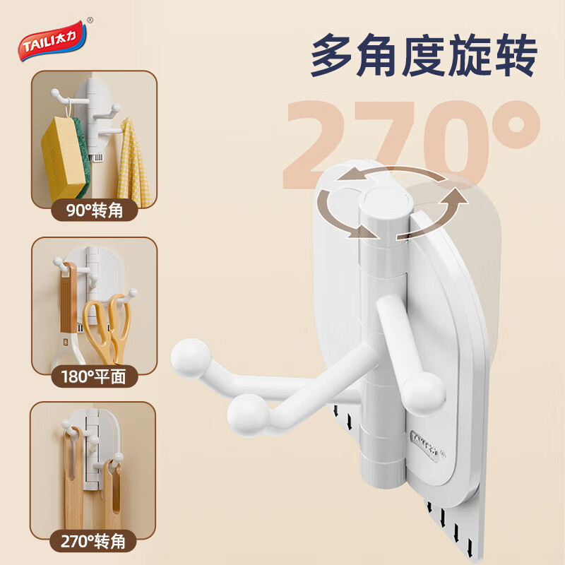 这款太力可旋转挂钩特别适用于厨房环境中小厨具、调料瓶等物品的悬挂收纳。它不仅能让您的厨房更加整洁有序,而且安装简便,无需任何工具即可轻松完成。用户反馈表示,在使用过程中确实感受到了它的便捷性与耐用性。