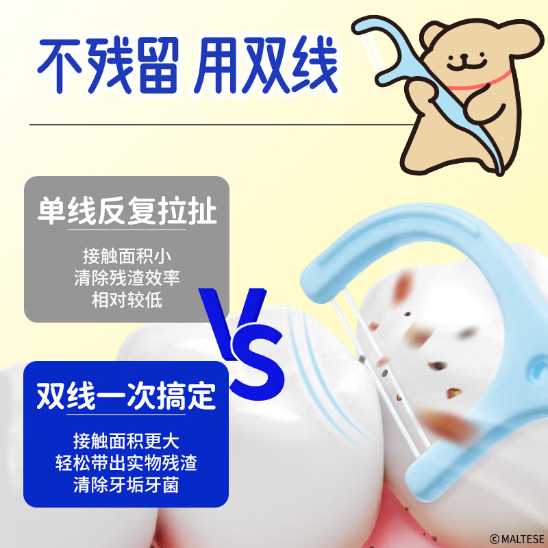 1. 护龈双线设计: 牙线棒采用双层柔软材质,有效保护牙龈,避免因清理不当造成伤害。