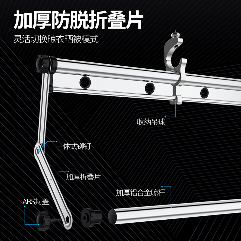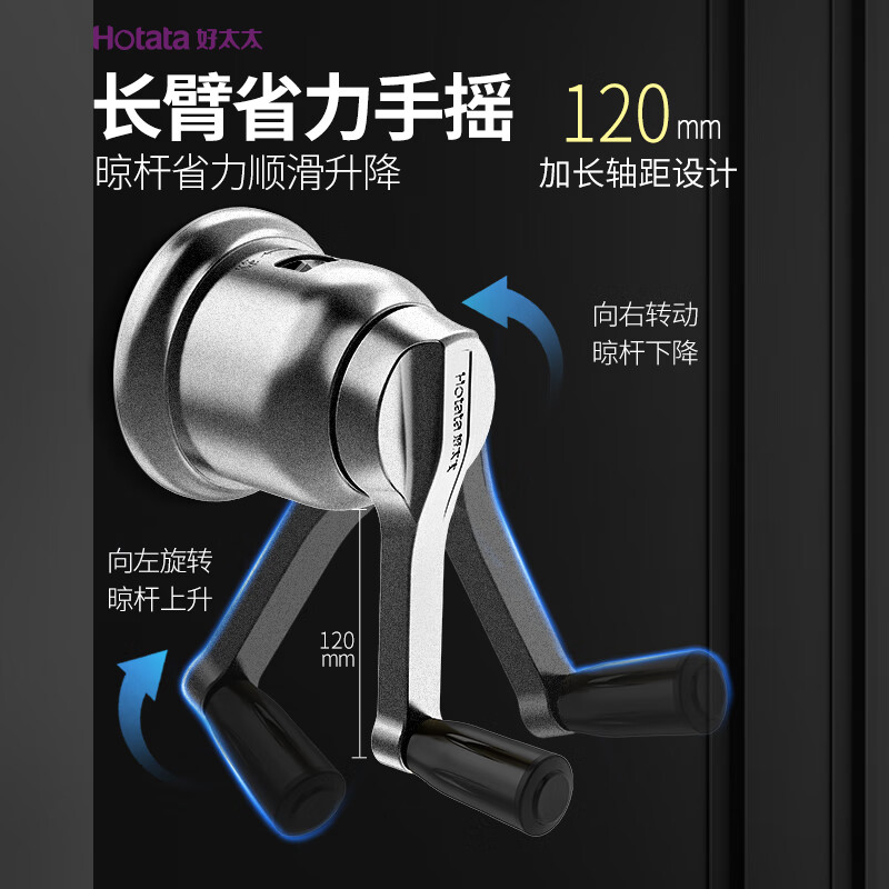 - 手动操作简易便捷: 手动摇杆设计让您可以轻松地进行升、降操作。无需借助其他工具,即可实现衣物的晾晒与收纳。