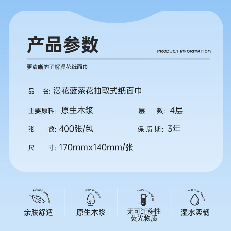 蓝茶花系列采用高品质原生木浆,确保纸巾柔软、细腻且吸水性极强。