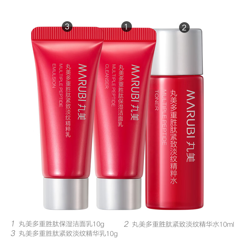 丸美套装 小红笔胜肽紧致淡纹洁水乳体验装,是您护肤的好选择。这款产品包含洁面、爽肤水和乳液各一份(分别为10g/10ml/10g),适合初次尝试或小样需求的消费者。