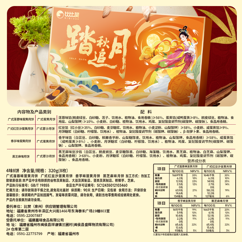 比比赞(BIBIZAN)踏秋追月月饼礼盒,内含4种口味、16个精美的月饼,总重量达320克,每一份都是中秋佳节的完美选择。这个产品不仅味道出众,包装也非常精美,适合送礼或家庭聚会享用。
