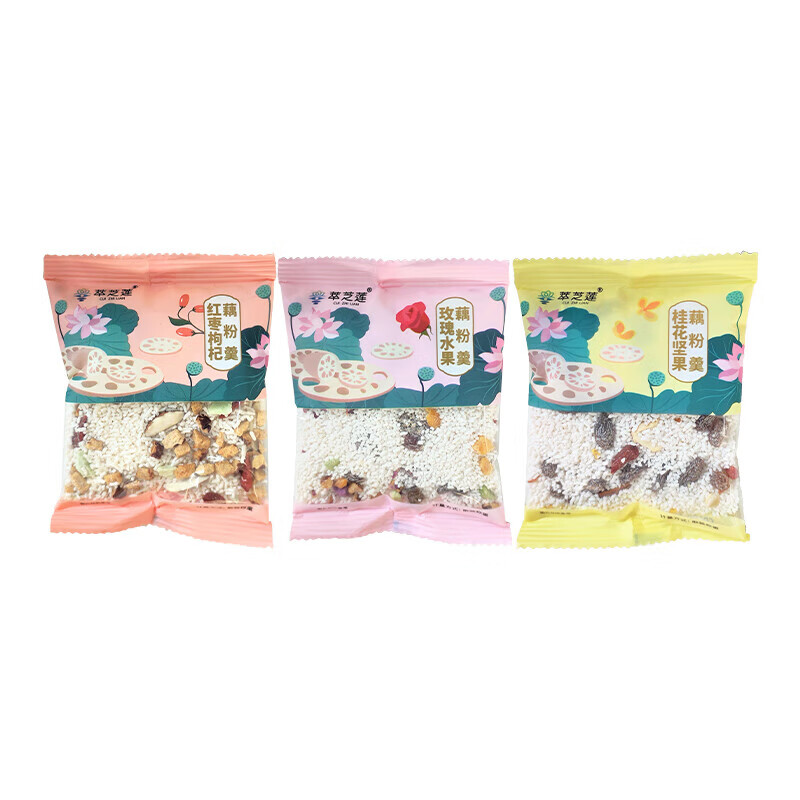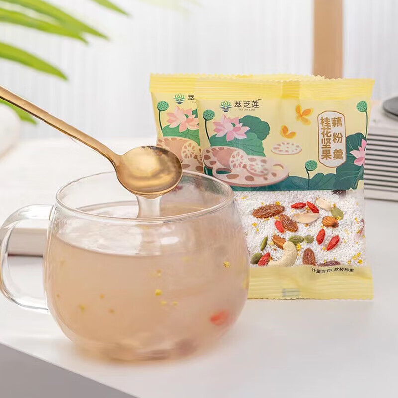 馋小赖藕粉羮,美味营养早餐选择!每袋30g,一盒五种不同的口味组合,桂花坚果、红枣枸杞和玫瑰等精心调制。