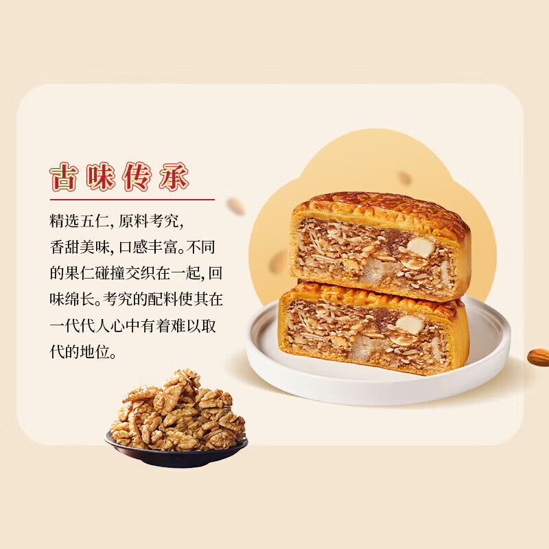 杏花楼作为中华老字号品牌,这款广式五仁月饼是中秋传统糕点的代表之一。每一块月饼都融入了匠心独具的传统工艺和高品质原料,不仅具有悠久的历史底蕴,更是现代人对于中秋节团圆美好祈愿的美好寄托。