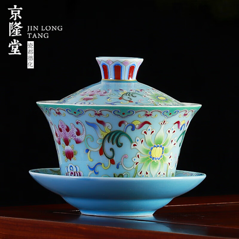 京隆堂推出的这套珐琅彩盖碗茶具,以其精美的四季山水绿釉色和匠心独运的设计,在众多的茶具中脱颖而出。340ml容量恰到好处,无论是家庭聚会还是个人品茗都非常适合。