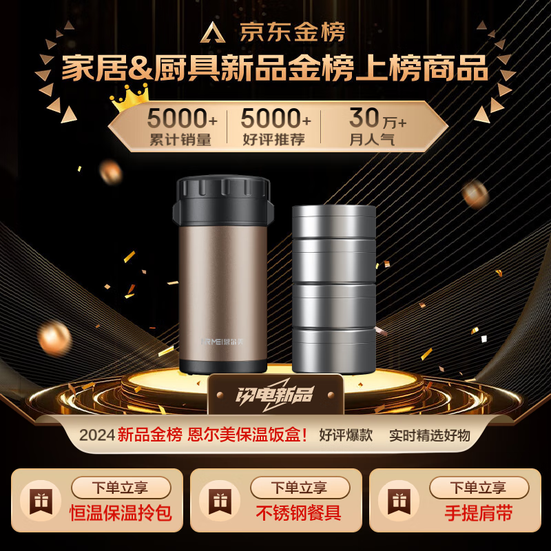 这款大容量多层便携餐盒不仅适合学生和上班族使用,还配有精美的拎包,方便携带。其设计美观大方,并有金色可选。恩尔美(nRMEi)的产品以品质卓越、服务贴心著称,在京东上已累计超过6万名买家的亲身体验分享。