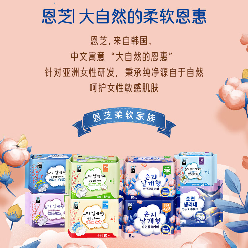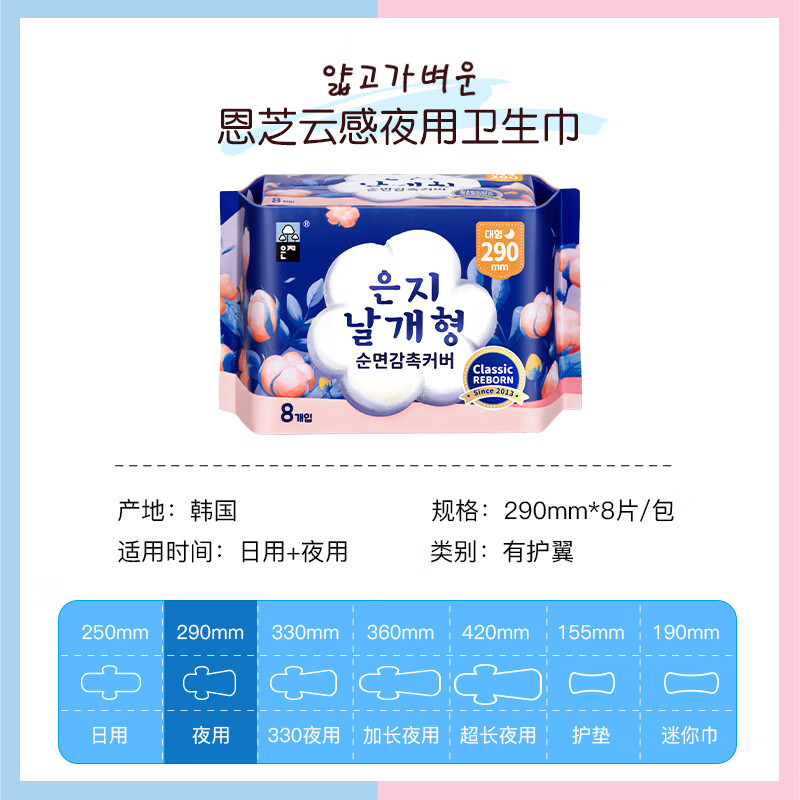 恩芝(Eunjee)韩国进口夜用卫生巾290mm8片纪念版绵柔亲肤护翼型速吸防漏姨妈巾