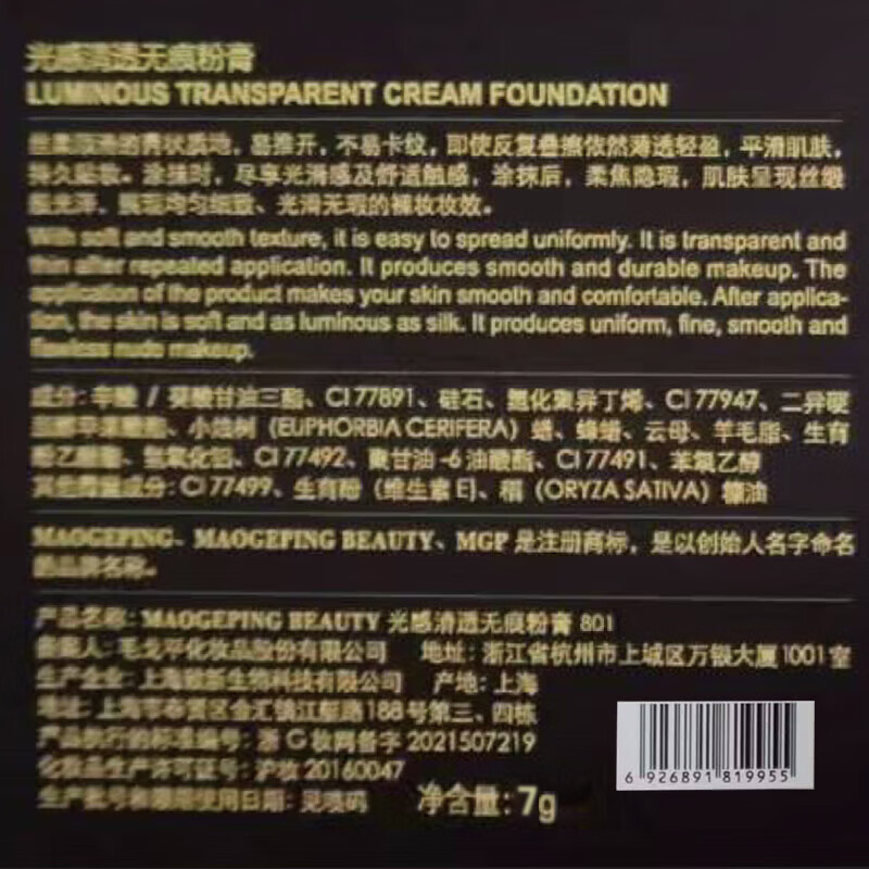 毛戈平陈丽君推荐清透粉膏 803 健康色,7g 防水遮瑕长效持久粉底膏。