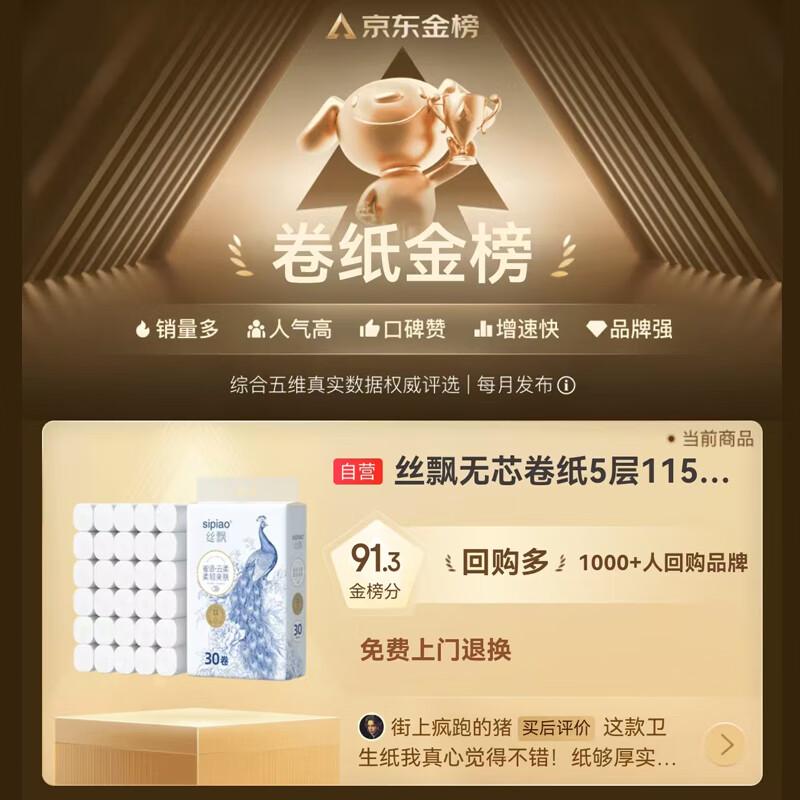 **丝飘无芯卷纸 5 层加厚,大容量装,超值特惠:只需 ¥36.9 即可享受家庭级囤货体验。这款厕纸不仅拥有惊人的克重和层数配置,更因其卓越的性价比深受广大消费者的青睐。