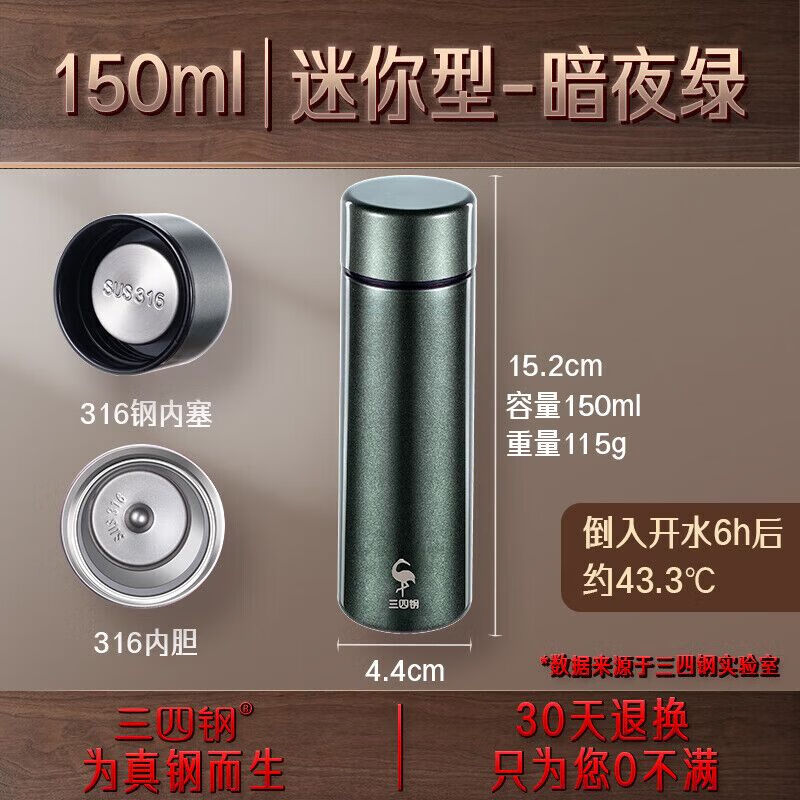 产品名称: 三四钢【新品】迷你保温杯316女士便携小巧小型水杯女口袋杯子小容量 法兰克福316随手杯暗夜绿150ml