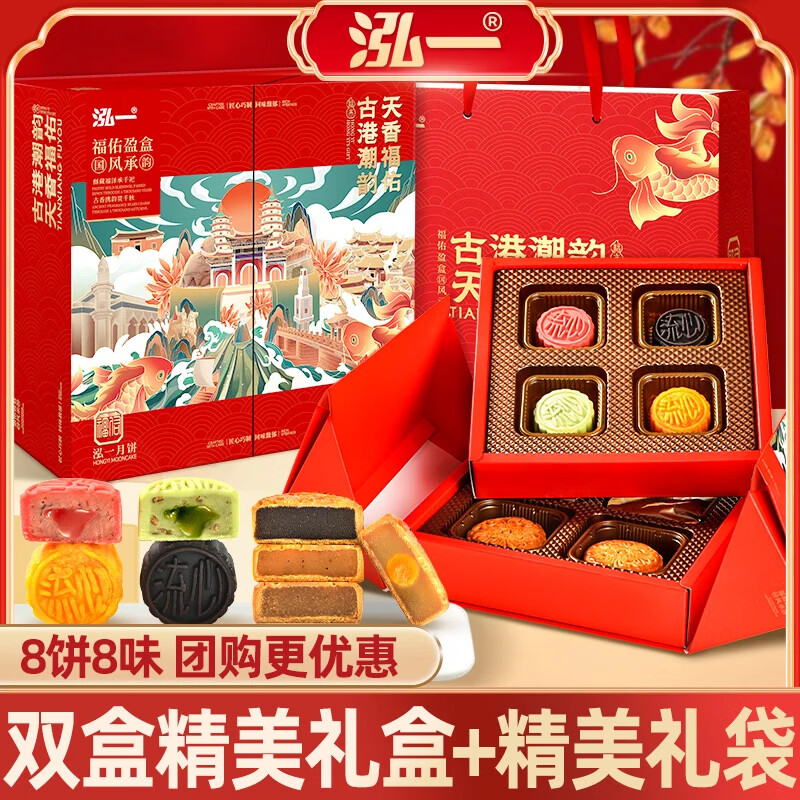 泓一月饼礼盒,双层设计,流心奶黄与广式莲蓉口味丰富。中秋佳节送礼首选,团购福利限时优惠,仅需39.9元。