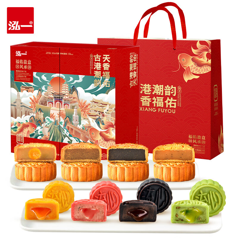 泓一月饼礼盒 流心奶黄广式莲蓉双层月饼中秋送礼福利团购多口味560g 仅39.9元