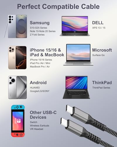 This cable is ideal for users of iPhone 16/15 series, iPad Pro/Air, Samsung Galaxy S25/S24, and other USB-C devices who require fast charging solutions.