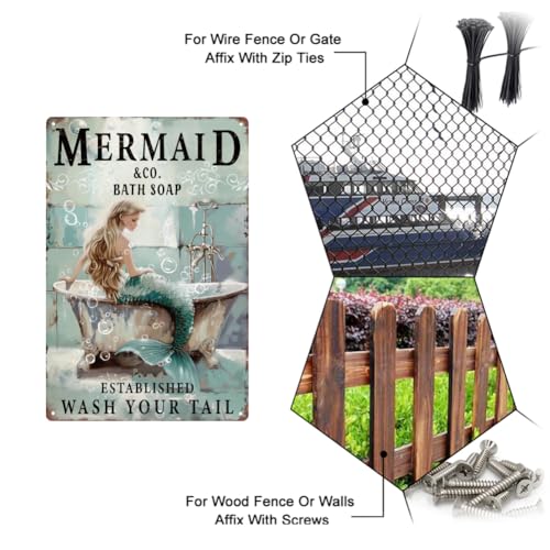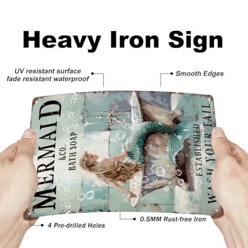 - Vintage tin poster decorates your bathroom with a mermaid in the tub.