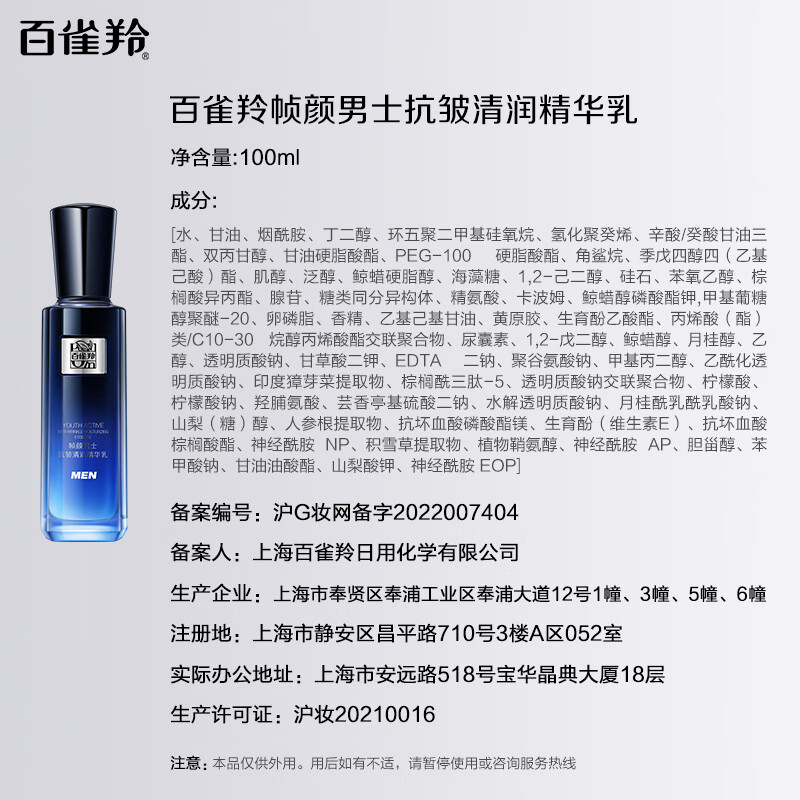 百雀羚帧颜男士抗皱保湿精华乳100ml,仅售258元!