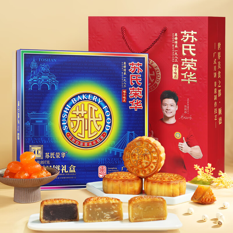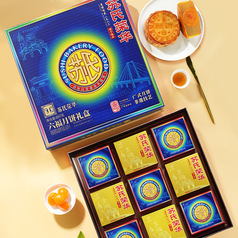 苏氏荣华月饼以经典蛋黄白莲蓉、双黄莲蓉和绿豆蓉等口味著称,本次特别推出包含红豆沙果仁的丰富馅料组合。每枚月饼均采用优质原材料精心制作,并且包装精美大方,非常适合中秋佳节赠送亲友。