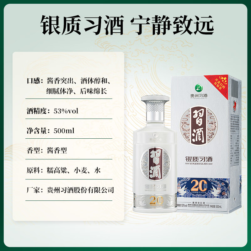 习酒 银质酱香型白酒,精选优质高粱、小麦为原料,在独特的工艺下酿造而成。以 53 度的浓郁酱香在业内独树一帜,口感醇厚细腻,回味无穷。