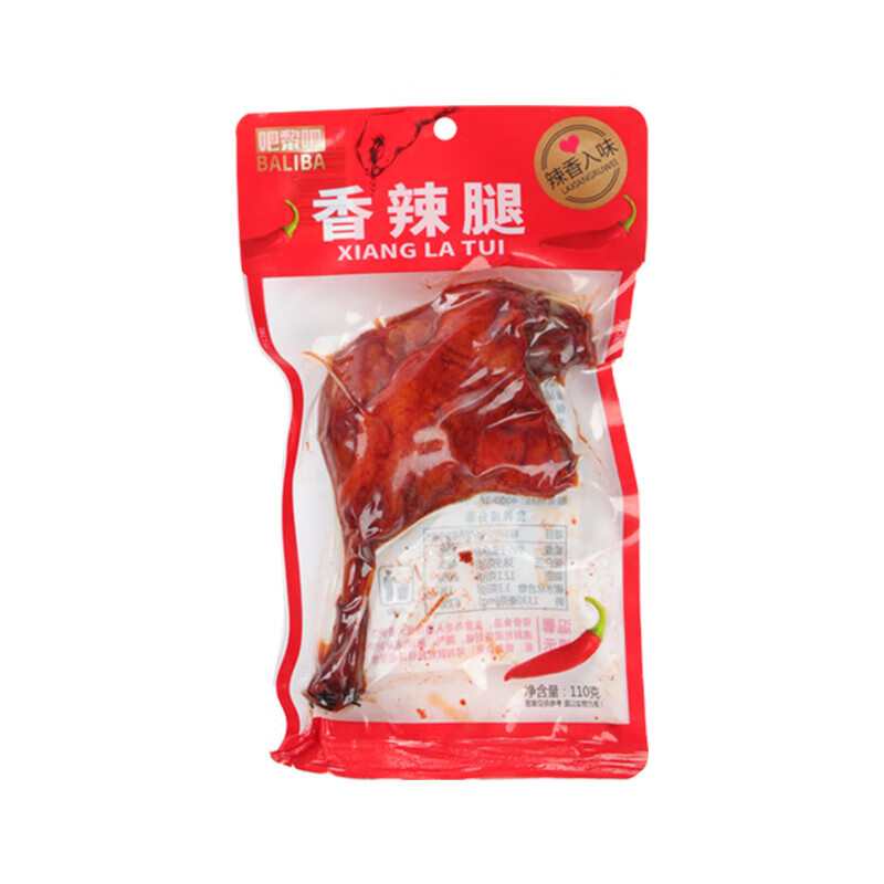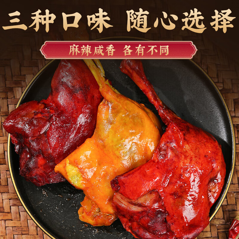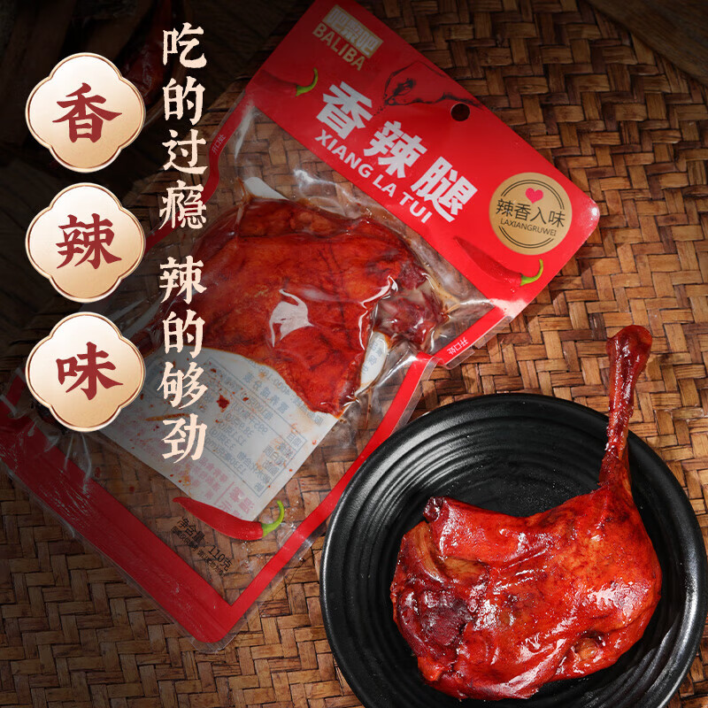 吧黎吧香卤鸭腿带来了前所未有的食用体验!精选110g包装的鸭腿包含3只大腿(口味:香酥、盐焗和香辣)+ 2只小腿(盲盒口味),让您一次品尝多种风味。