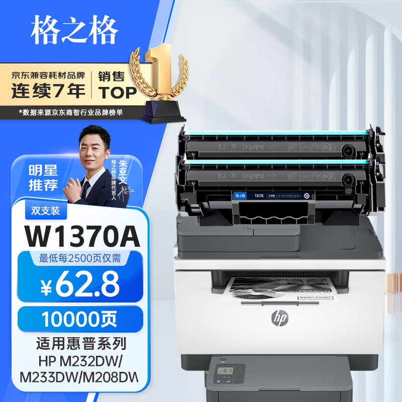 格之格m232dw硒鼓 w1370a硒鼓双支装,适合hp233dw硒鼓 m233sdn m233sdw m208dw打印机使用,带芯片的大容量硒鼓,保证打印品质。原价¥259,现在仅售¥199,更有京东优惠券可用。