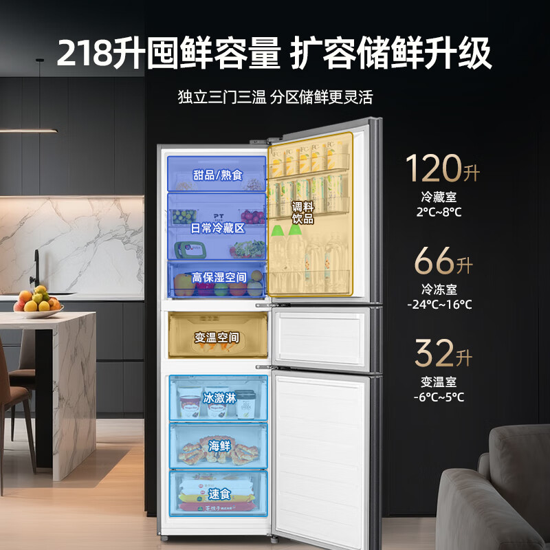 七星SEVENSTARS风冷无霜二级能效三门冰箱,家庭宿舍租房省电必备,低噪冷冻冷藏微冷三用,容量218升,钛银灰外观,优惠价格仅需837.44元!