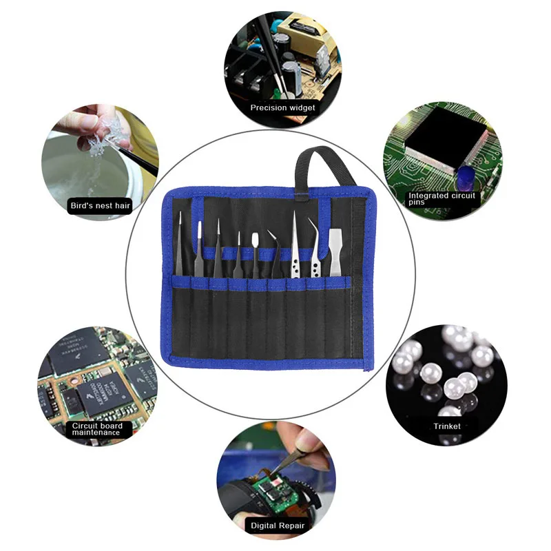 - Versatile Set: 9 different tweezers in one package, perfect for all your repair needs.