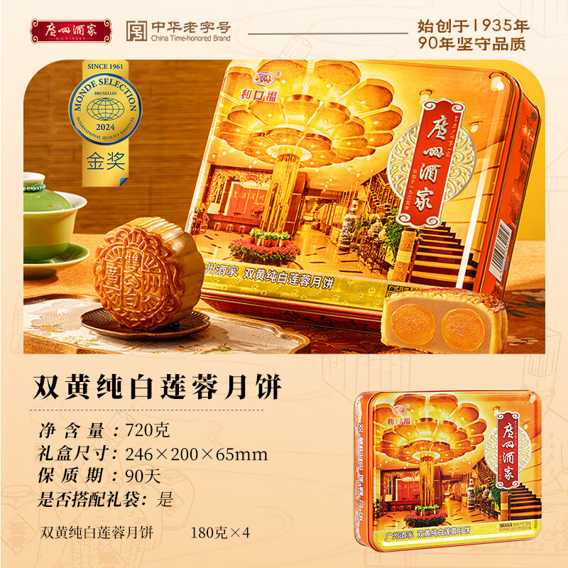 **中秋佳节,选择广州酒家的经典月饼无疑是一个完美的决定。这款双黄纯白莲蓉月饼礼盒装重达720g,融合了广式经典风味与现代包装设计,确保每位收到这份礼物的人感受到来自中华老字号的品质和温暖。