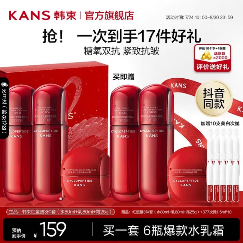 韩束红蛮腰水乳护肤品套装集抗皱紧致、淡化皱纹功能于一体,现价仅199元,同类超低价,适合送女友妈妈等亲朋好友作为礼物。