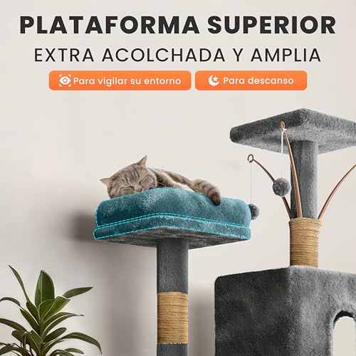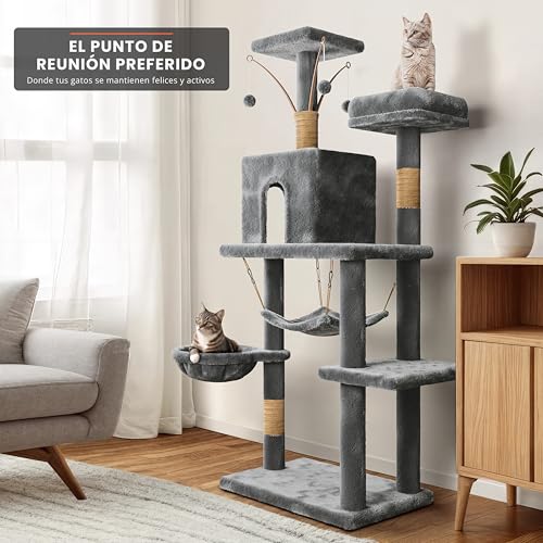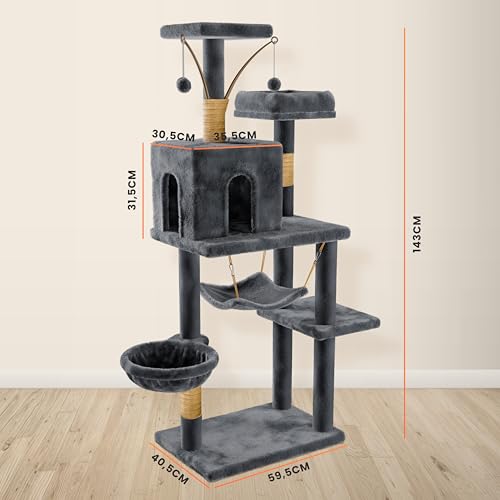 This JUPPLIES cat tree tower stands at an impressive 143 cm tall, offering a variety of features that will keep your cats entertained and healthy. Perfect for active cats who love to climb and play, this sturdy structure provides ample space for them to stretch their legs.