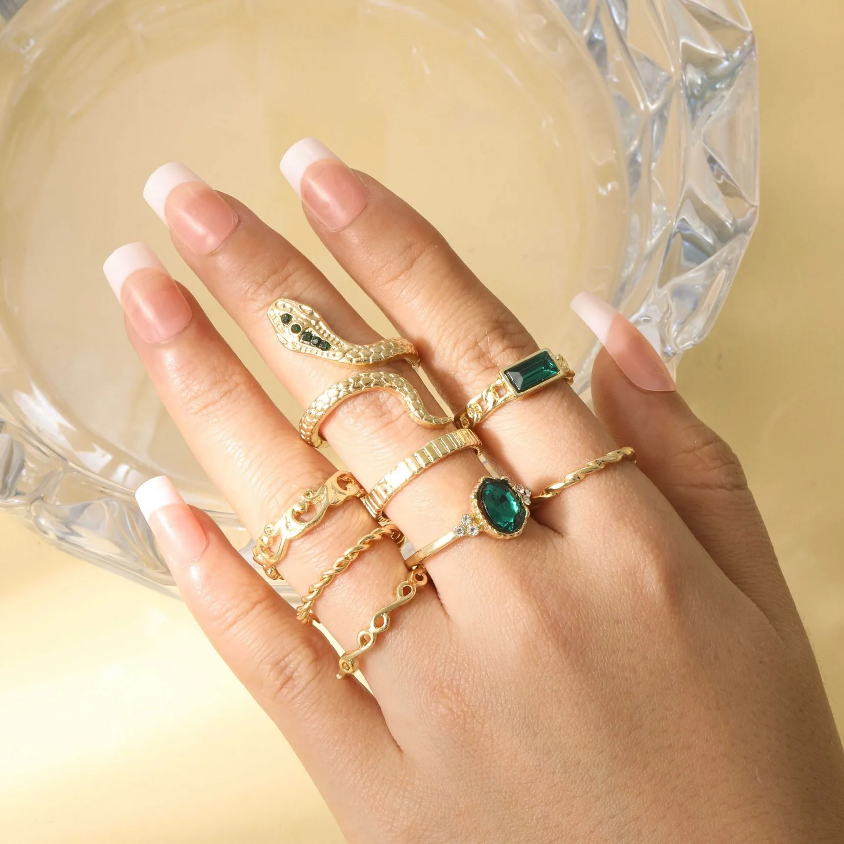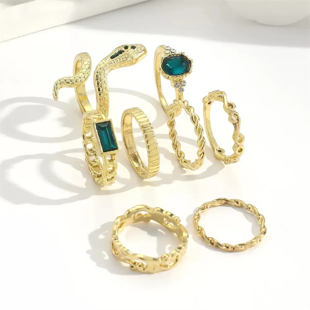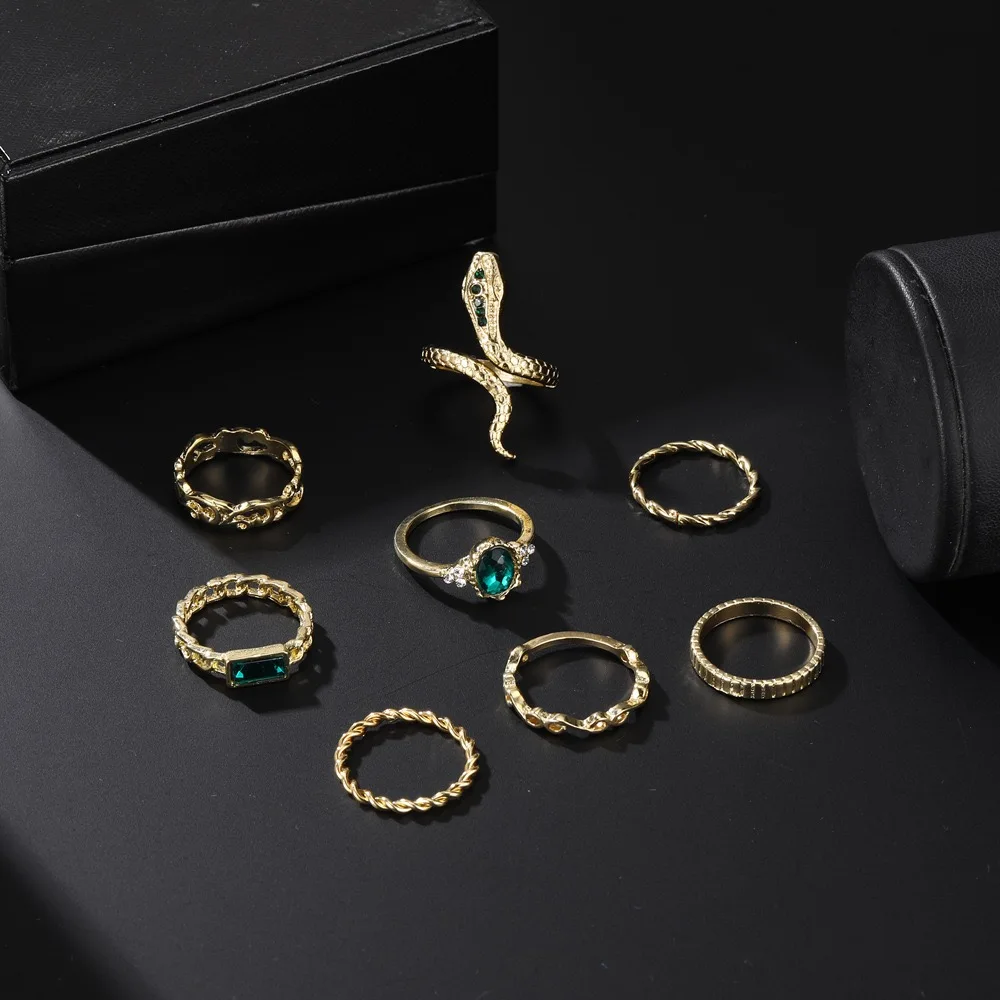 Are you looking for a unique and eye-catching accessory to complete your retro fashion look? Look no further! Our 8PCS Set of Fashionable and Retro Imitation Gemstone Snake-Shaped Twisted Rings are the perfect choice.