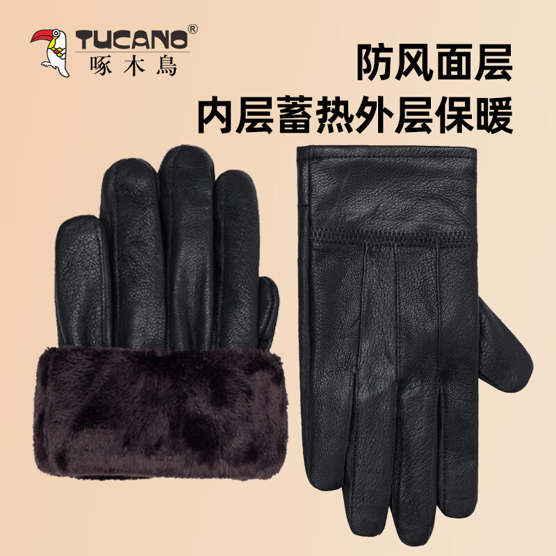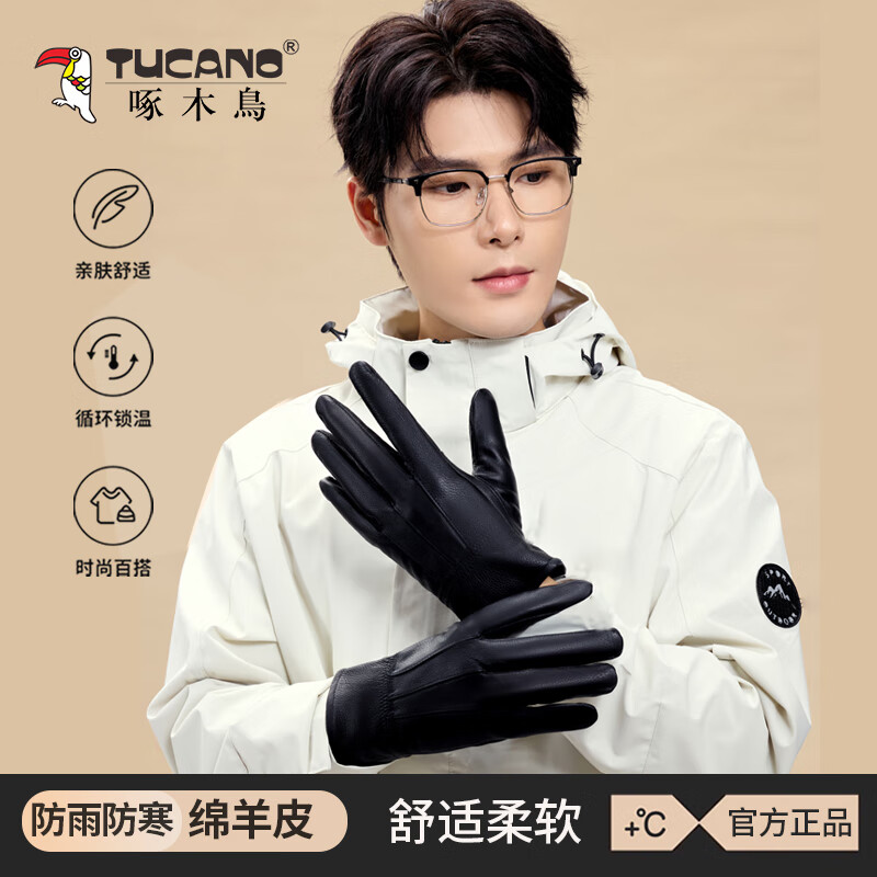 啄木鸟(TUCANO)冬季男士真皮手套,羊皮材质,触屏设计,防泼水加绒保暖款。