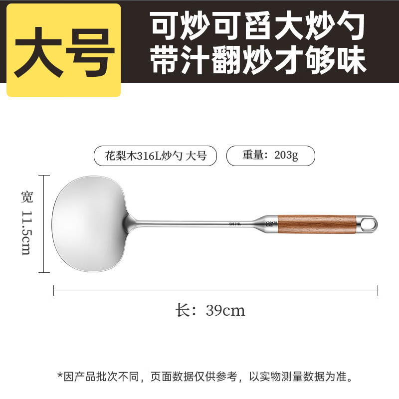 炊大皇316L不锈钢炒勺锅铲,专为家庭厨房设计的优质烹饪工具。采用耐腐蚀、不易生锈的316L不锈钢材质,确保每次下厨都能享受健康放心的食材处理过程。此外,锅铲手柄选用花梨木材质,天然环保且握感舒适,即便长时间使用也不会感到疲劳。