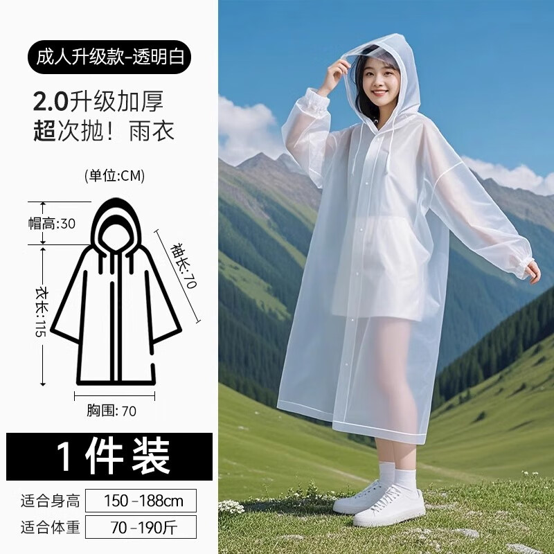 产品详情 呈现一款专为成人设计的加厚便携防暴雨雨披,此款爱康尼一次性雨衣采用白色长款设计,配合电动车使用也尤为适用。它具备帽檐、全面防水、抗风性能强等优势特点,是春季和夏季出行的理想选择。
