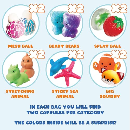 • Diverse Surprises: Each capsule contains unique items such as Splat Balls, Mesh Balls, Sticky Sea Animals, Beady Bears, Squishy Animals, and Stretchy Animals.