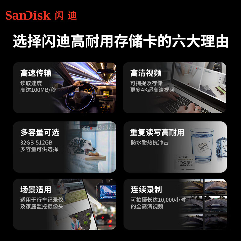 闪迪(SanDisk)128GB TF(MicroSD)内存卡专为行车记录仪、监控摄像头及其他便携设备设计。此款10,000小时录制专用存储卡,4K视频的高耐用性与高效读写性能使其成为市场上备受关注的选择。