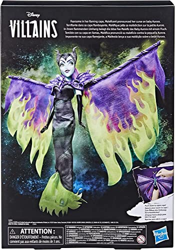 - CAPABLE OF BEING OPENED AND CLOSED: Pressing the lever on the back of the Maléfica doll allows her extravagant green and purple cape to unfold, adding an extra layer of playfulness and excitement for children aged 5+.