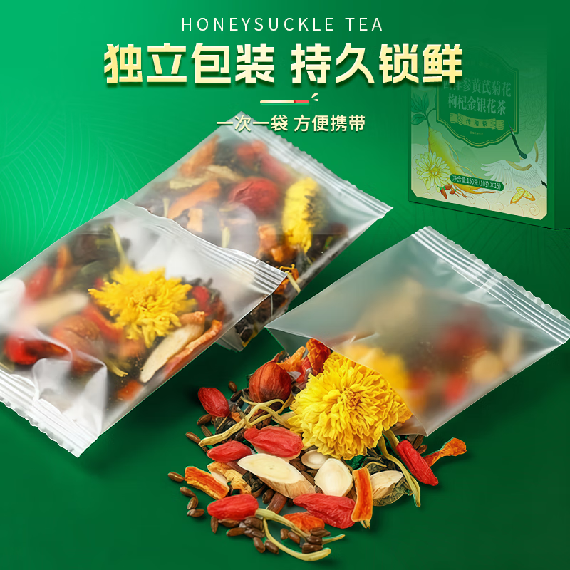 **同仁堂西洋参黄芪菊花枸杞金银花养肝护肝茶,去火补气养生150克共15小袋。这款精心调制的茶叶集合了多种天然草本精华,如西洋参、黄芪、菊花和枸杞等成分,致力于为您的健康保驾护航。