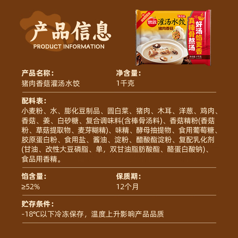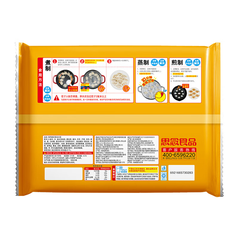 思念品牌的这款猪肉香菇灌汤水饺以其独特的口感和丰富的营养成分受到了广大消费者的喜爱。每一只水饺都是精心制作,新鲜出炉,保证了消费者品尝到的是最新鲜最美味的味道。