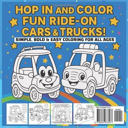 - Relaxing scenes: Calming pages featuring ride-on cars and trucks that promote mindfulness and creativity.