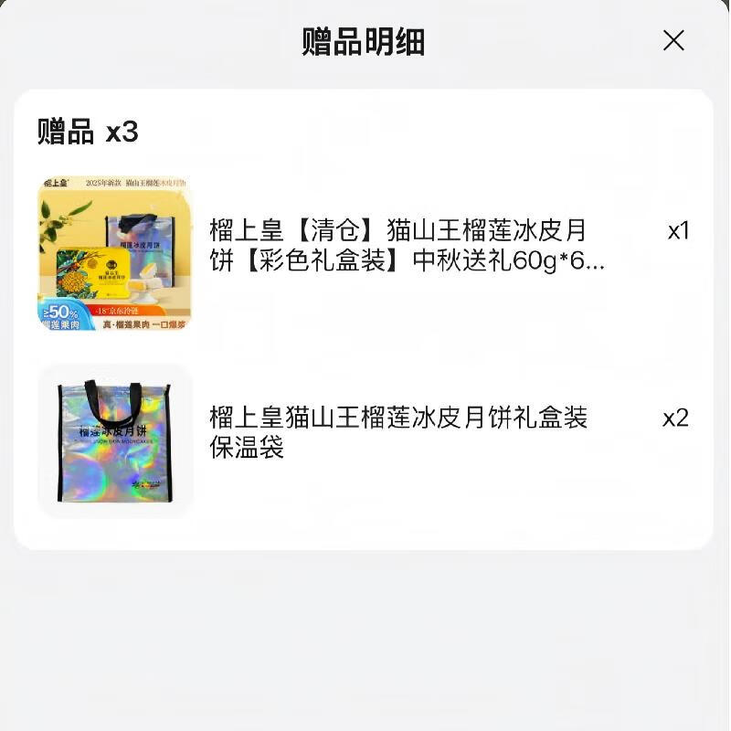榴上皇【清仓】猫山王榴莲冰皮月饼,60g*6枚装,彩色礼盒设计精美。采用上等的猫山王榴莲果肉,每一口都是满满的浓郁醇香。中秋送礼的首选,无论是自用还是赠送亲友都非常合适。