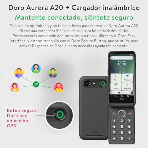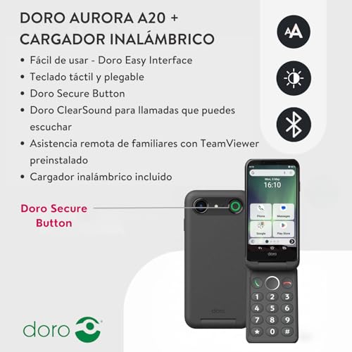 The Doro Aurora A20 is designed for seniors with easy-to-use features like a numeric keypad, large display, and an emergency SOS button. It offers clear sound quality, a 13MP camera, and compatibility with hearing aids.
